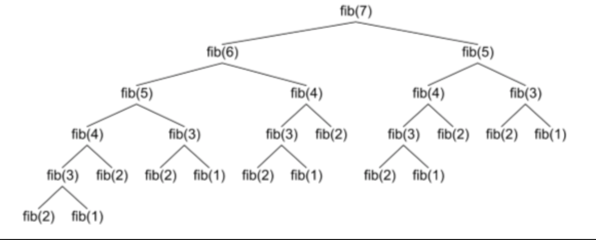 첫 번째와 두 번째가 1인 피보나치 수를 예로 들어보자. 피보나치 수를 재귀적으로 구한다면 위에서 볼 수 있듯이 fib(3), fib(4)등 앞선 피보나치 수가 여러 번 호출된다.